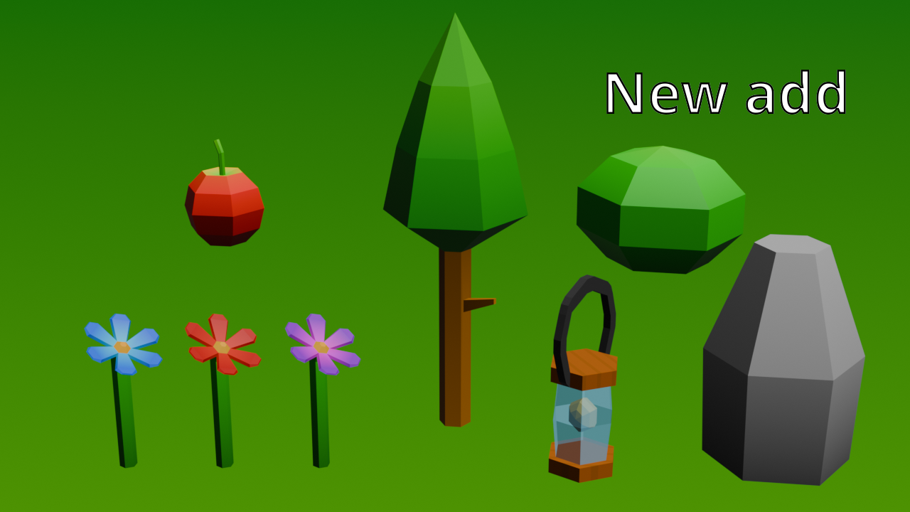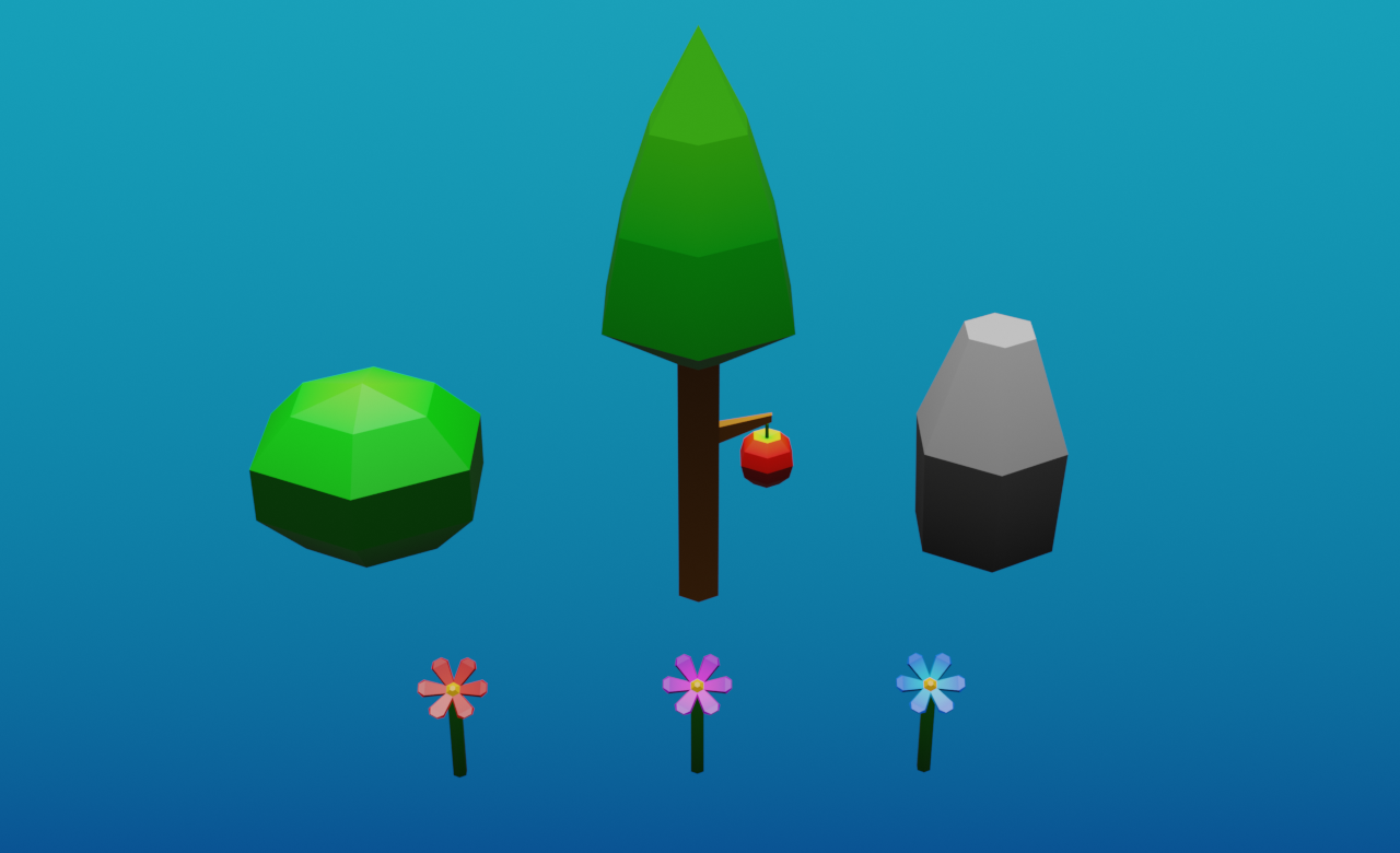 Note: in the 3D models of the tree, stone and apple, bush and flowers were applied a vertex paint, I wanted to do a test, I wanted to create a gradient effect on the 3D mesh, I found the result interesting and I intend to add more 3D models like this.